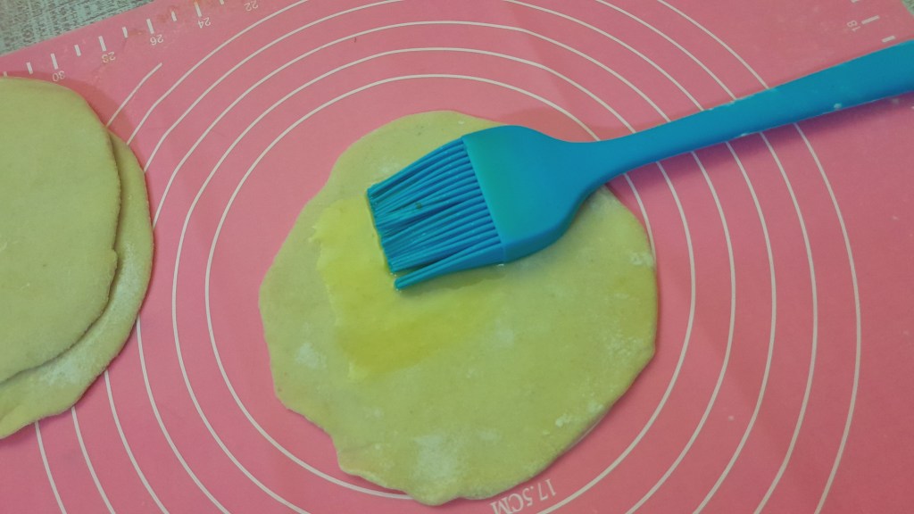 Kembali ke adonan. Mari kita poles adonan pertama yang sudah dirollin menggunakan pklesan yang tadi kita buat. Lalu tumpuk adonan yang sudah dipoles dengn adonan yang sudah dirollin. Catatan: bisa di tumpuk sampai 3 adonan yah.