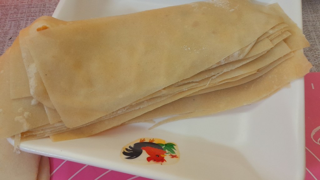 Setelah dibentuk/dirollin sesuai keinginan. Panaskan wajan dengan api yang sangat kecil lalu masukkan adonan yang sudah tipis, jangan terlalu lama balik adonan kemudian angkat perkiraan waktunya adalah 45 detik.